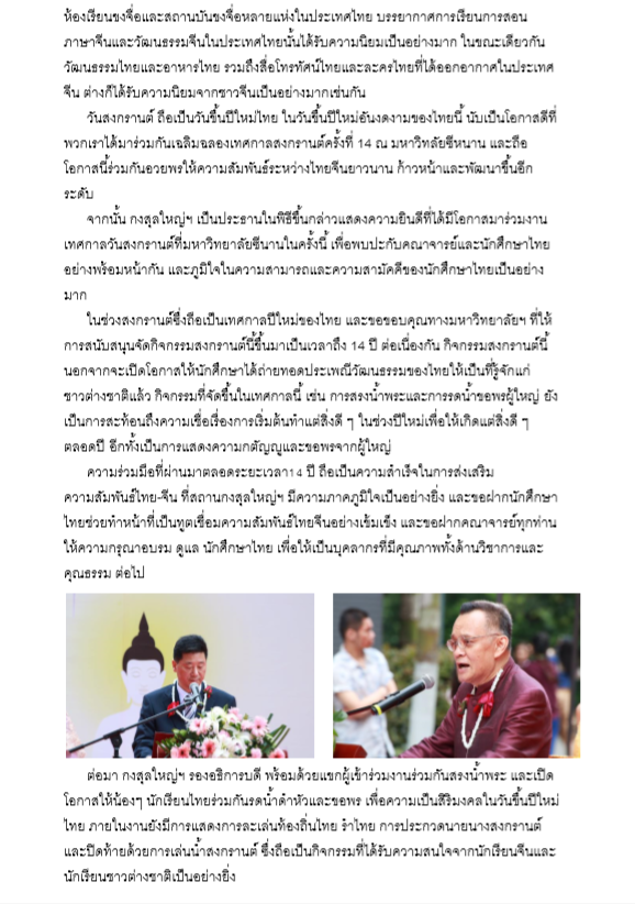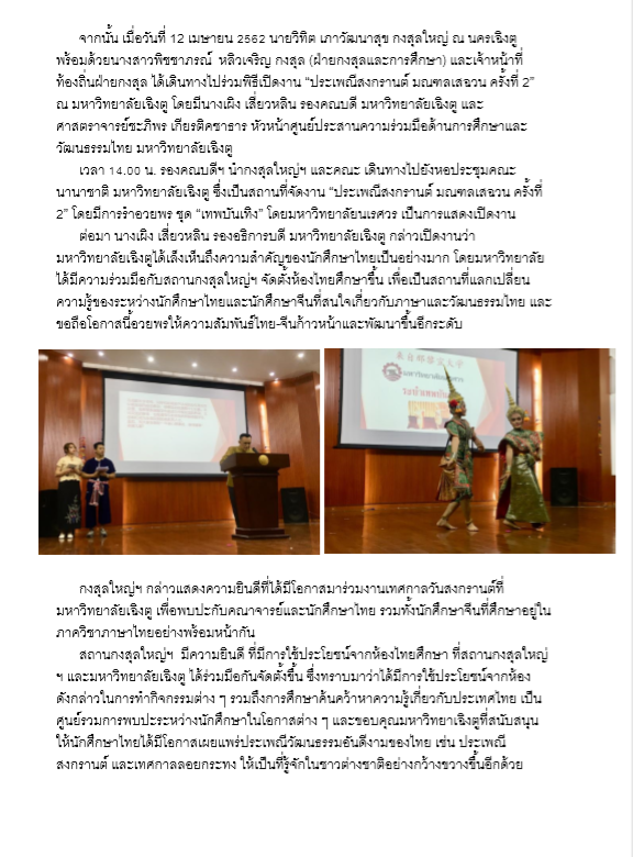 สถานกงสุลใหญ่ ณ นครเฉิงตู จัด‘งานเทศกาลมหาสงกรานต์ร่วมกับ มหาวิทยาลัยซีหนาน มหานครฉงชิ่ง และมหาวิทยาลัยเฉิงตู นครเฉิงตู