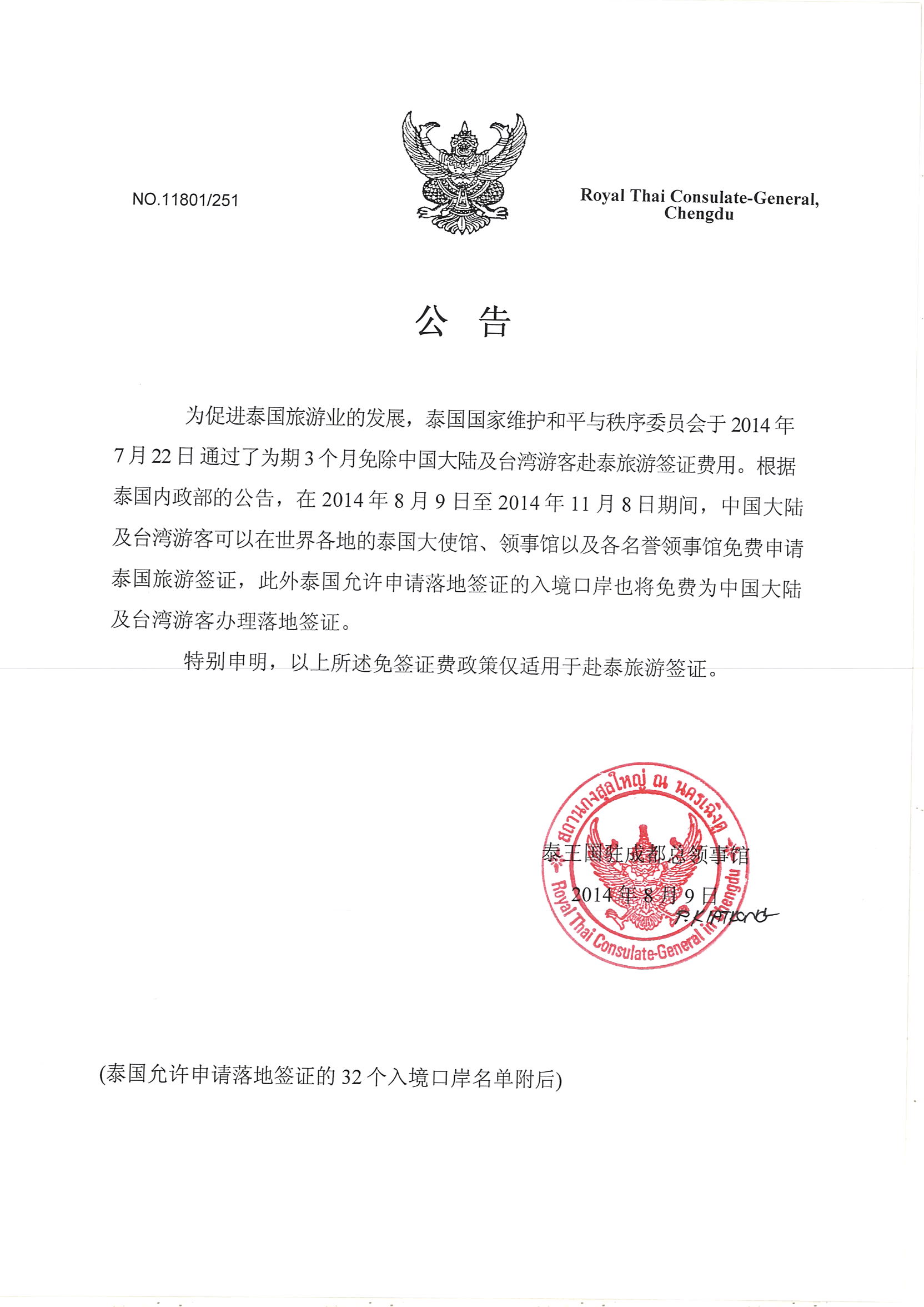 ประกาศ การยกเว้นค่าธรรมเนียมการตรวจลงตราให้แก่นักท่องเที่ยวจีนและไทเป